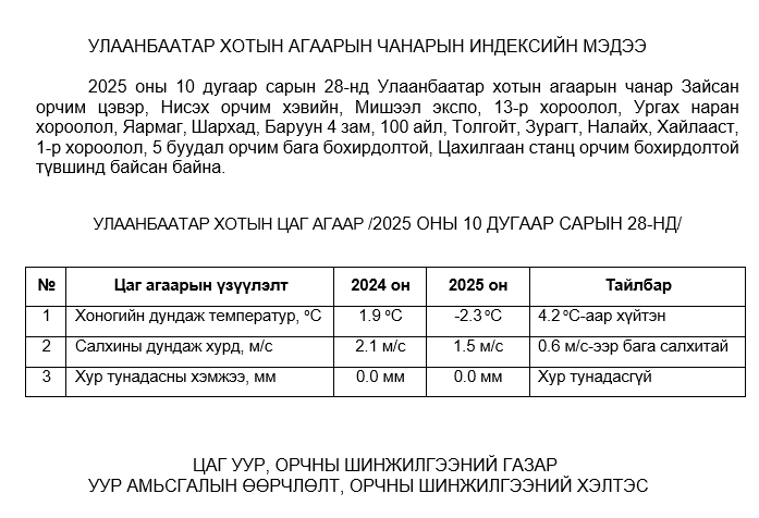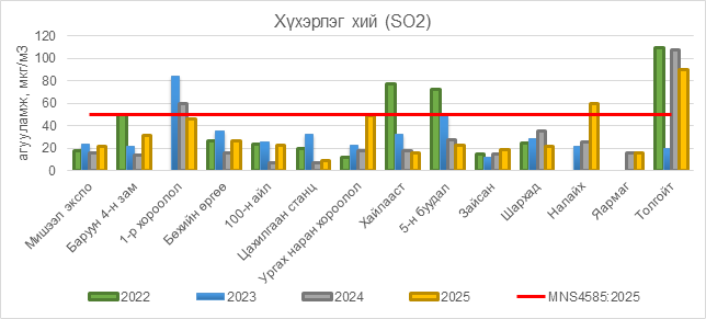 2025 оны 10 дугаар сарын 28-ны байдлаар хүхэрлэг хий (SO2) нь Налайх орчим АЧС-аас 10 мкг/м3 –ээр их, Толгойт орчим АЧС-аас 40 мкг/м3 –ээр их, бусад цэгүүдэд MNS 4585:2025 АЧС-аас даваагүй байна.