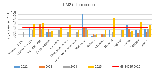 РМ2.5 тоосонцор нь Мишээл экспо орчим АЧС-аас 74 мкг/м3 –ээр их, Баруун 4 зам орчим АЧС-аас 12.5 мкг/м3 –ээр их, 1-р хороолол орчим АЧС-аас 18.5 мкг/м3 –ээр их, 100 айл орчим АЧС-аас 1.5 мкг/м3 –ээр их, Цахилгаан станц орчим АЧС-аас 10.5 мкг/м3 –ээр их, Налайх орчим АЧС-аас 40.5 мкг/м3 –ээр их, Толгойт орчим АЧС-аас 23.5 мкг/м3 –ээр их, Зурагт орчим АЧС-аас 9.5 мкг/м3 –ээр их, бусад цэгүүдэд MNS 4585:2025 АЧС-аас даваагүй байна.