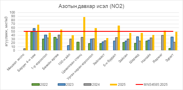 Азотын давхар исэл (NO2) нь Баруун 4-н зам орчим АЧС-аас 18 мкг/м3 –ээр их, Бөхийн өргөө орчим АЧС-аас 5 мкг/м3 –ээр их, Цахилгаан станц орчим АЧС-аас 38 мкг/м3 –ээр их, Ургах наран хороолол орчим АЧС-аас 9 мкг/м3 –ээр их, 5-н буудал орчим АЧС-аас 16 мкг/м3 –ээр их, Яармаг орчим АЧС-аас 2 мкг/м3 –ээр их, бусад цэгүүдэд MNS 4585:2025 АЧС-аас даваагүй байна.