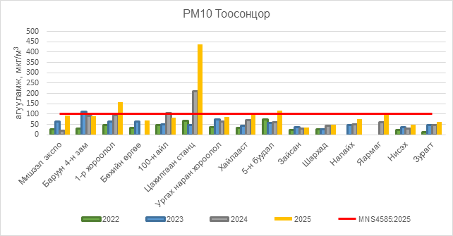 РМ10 тоосонцор нь 1-р хороолол орчим АЧС-аас 58 мкг/м3 –ээр их, Цахилгаан станц орчим АЧС-аас 338 мкг/м3 –ээр их, 5-н буудал орчим АЧС-аас 17 мкг/м3 –ээр их, Яармаг орчим АЧС-аас 5 мкг/м3 –ээр их, бусад цэгүүдэд MNS 4585:2025 АЧС-аас даваагүй байна.