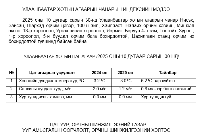 УЛААНБААТАР ХОТЫН АГААРЫН ЧАНАРЫН ХЯНАЛТ ШИНЖИЛГЭЭНИЙ ХОНОГИЙН МЭДЭЭ /2025.10.30/