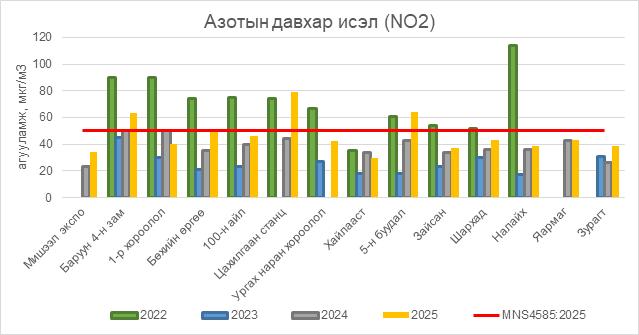 Азотын давхар исэл (NO2) нь Баруун 4-н зам орчим АЧС-аас 13 мкг/м3 –ээр их, Цахилгаан станц орчим АЧС-аас 29 мкг/м3 –ээр их, 5-н буудал орчим АЧС-аас 14 мкг/м3 –ээр их, бусад цэгүүдэд MNS 4585:2025 АЧС-аас даваагүй байна.
