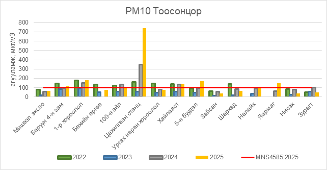 РМ10 тоосонцор нь Баруун 4-н зам орчим АЧС-аас 14 мкг/м3 –ээр их, 1-р хороолол орчим АЧС-аас 79 мкг/м3 –ээр их, Цахилгаан станц орчим АЧС-аас 643 мкг/м3 –ээр их, Хайлааст орчим АЧС-аас 38 мкг/м3 –ээр их, 5-н буудал орчим АЧС-аас 68 мкг/м3 –ээр их, Яармаг орчим АЧС-аас 48 мкг/м3 –ээр их, бусад цэгүүдэд MNS 4585:2025 АЧС-аас даваагүй байна.