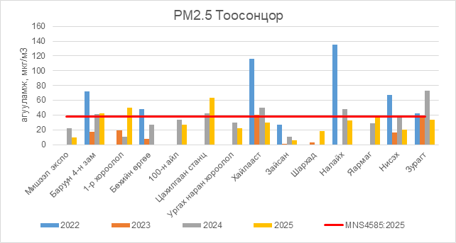 РМ2.5 тоосонцор нь Баруун 4-н зам орчим АЧС-аас 4.5 мкг/м3 –ээр их, 1-р хороолол орчим АЧС-аас 12.5 мкг/м3 –ээр их, Цахилгаан станц орчим АЧС-аас 25.5 мкг/м3 –ээр их, бусад цэгүүдэд MNS 4585:2025 АЧС-аас даваагүй байна.