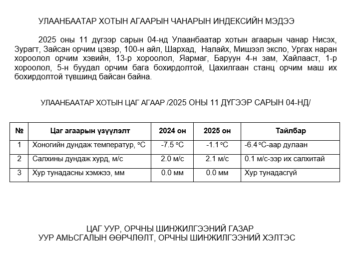 2025 оны 11 дүгээр сарын 04-ний байдлаар хүхэрлэг хий (SO2) нь 1-р хороолол орчим 3 мкг/м3 –ээр их, 5-н буудал орчим 54 мкг/м3 –ээр их, бусад цэгүүдэд MNS 4585:2025 АЧС-аас даваагүй байна.