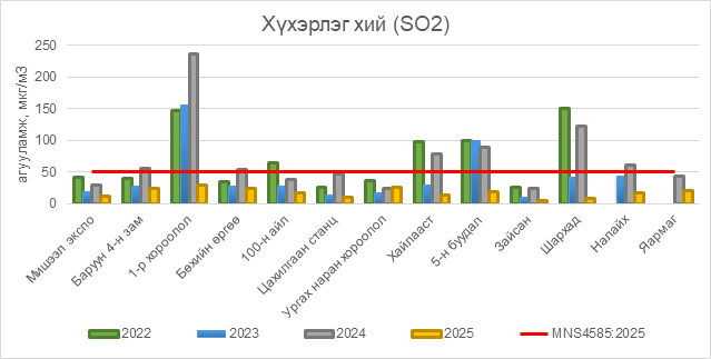 2025 оны 11 дүгээр сарын 06-ны байдлаар хүхэрлэг хий (SO2) нь бүх цэгүүдэд MNS 4585:2025 АЧС-аас даваагүй байна.