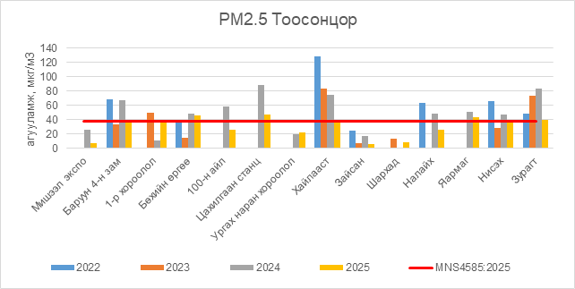 РМ2.5 тоосонцор нь Бөхийн өргөө орчим АЧС-аас 8.5 мкг/м3 –ээр их, Цахилгаан станц орчим АЧС-аас 9.5 мкг/м3 –ээр их, Яармаг орчим АЧС-аас 5.5 мкг/м3 –ээр их, Нисэх орчим АЧС-аас 2.5 мкг/м3 –ээр их, Толгойт орчим АЧС-аас 2.5 мкг/м3 –ээр их, бусад цэгүүдэд MNS 4585:2025 АЧС-аас даваагүй байна.