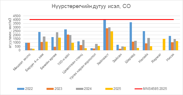 Нүүрстөрөгчийн дутуу исэл (СО) нь бүх цэгүүдэд MNS 4585:2025 АЧС-аас даваагүй байна.