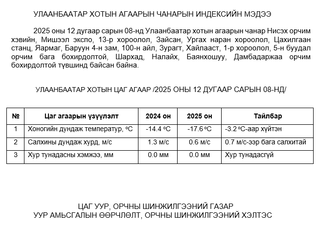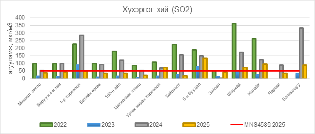2025 оны 12 дугаар сарын 08-ны байдлаар хүхэрлэг хий (SO2) нь Ургах наран хороолол орчим АЧС-аас 23 мкг/м3 –ээр их, 5-н буудал орчим АЧС-аас 84 мкг/м3 –ээр их, Шархад орчим АЧС-аас 22 мкг/м3 –ээр их, Налайх орчим АЧС-аас 44 мкг/м3 –ээр их, Баянхошуу орчим АЧС-аас 39 мкг/м3 –ээр их, бусад цэгүүдэд MNS 4585:2025 АЧС-аас даваагүй байна.