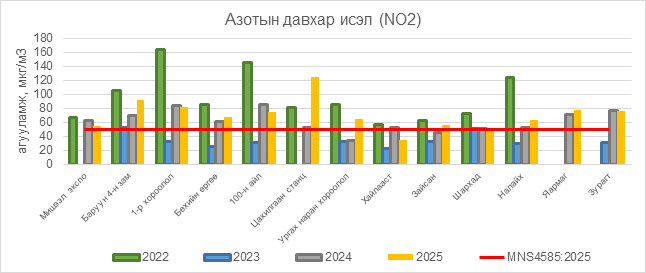 Азотын давхар исэл (NO2) нь Мишээл экспо орчим АЧС-аас 4 мкг/м3 –ээр их, Баруун 4-н зам орчим АЧС-аас 42 мкг/м3 –ээр их, 1-р хороолол орчим 31 мкг/м3 –ээр их, Бөхийн өргөө орчим АЧС-аас 18 мкг/м3 –ээр их, 100-н айл орчим АЧС-аас 24 мкг/м3 –ээр их, Цахилгаан станц орчим АЧС-аас 75 мкг/м3 –ээр их, Ургах наран хороолол орчим АЧС-аас 15 мкг/м3 –ээр их, Зайсан орчим АЧС-аас 6 мкг/м3 –ээр их, Шархад орчим АЧС-аас 1 мкг/м3 –ээр их, Налайх орчим АЧС-аас 13 мкг/м3 –ээр их, Яармаг орчим АЧС-аас 28 мкг/м3 –ээр их, Зурагт орчим АЧС-аас 26 мкг/м3 –ээр их, бусад цэгүүдэд MNS 4585:2025 АЧС-аас даваагүй байна.