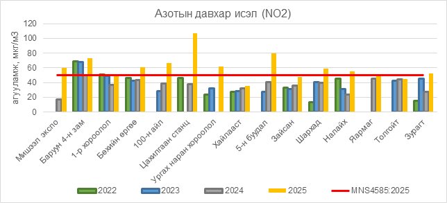 Азотын давхар исэл (NO2) нь Мишээл экспо орчим АЧС-аас 10 мкг/м3 –ээр их, Баруун 4 зам орчим АЧС-аас 23 мкг/м3 –ээр их, Бөхийн өргөө орчим АЧС-аас 11 мкг/м3 –ээр их, 100 айл орчим АЧС-аас 16 мкг/м3 –ээр их, Цахилгаан станц орчим АЧС-аас 57 мкг/м3 –ээр их, Ургах наран хороолол орчим АЧС-аас 12 мкг/м3 –ээр их, 5 буудал орчим АЧС-аас 30 мкг/м3 –ээр их, Шархад орчим АЧС-аас 9 мкг/м3 –ээр их, Налайх орчим АЧС-аас 5 мкг/м3 –ээр их, Зурагт орчим АЧС-аас 2 мкг/м3 –ээр их, бусад цэгүүдэд MNS 4585:2025 АЧС-аас даваагүй байна.