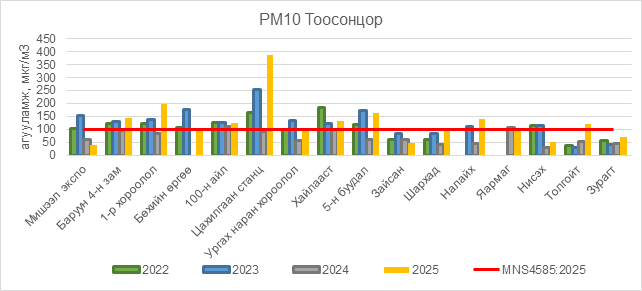 РМ10 тоосонцор нь Мишээл экспо орчим АЧС-аас 50 мкг/м3 –ээр их, Баруун 4 зам орчим АЧС-аас 42 мкг/м3 –ээр их, 1-р хороолол орчим АЧС-аас 98 мкг/м3 –ээр их, Бөхийн өргөө орчим АЧС-аас 3 мкг/м3 –ээр их, 100 айл орчим АЧС-аас 23 мкг/м3 –ээр их, Цахилгаан станц орчим АЧС-аас 289 мкг/м3 –ээр их, Ургах наран хороолол орчим АЧС-аас 6 мкг/м3 –ээр их, Хайлааст орчим АЧС-аас 32 мкг/м3 –ээр их, 5 буудал орчим АЧС-аас 63 мкг/м3 –ээр их, Налайх орчим АЧС-аас 41 мкг/м3 –ээр их, Яармаг орчим АЧС-аас 6 мкг/м3 –ээр их, Толгойт орчим АЧС-аас 21 мкг/м3 –ээр их, бусад цэгүүдэд MNS 4585:2025 АЧС-аас даваагүй байна.