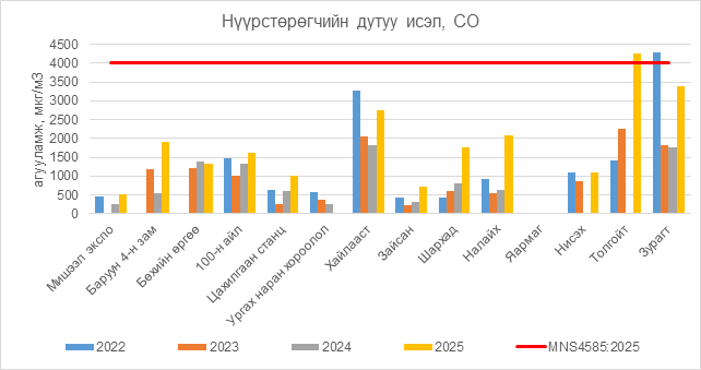 Нүүрстөрөгчийн дутуу исэл (СО) нь Толгойт орчим АЧС-аас 270 мкг/м3 –ээр их, бүх цэгүүдэд MNS 4585:2025 АЧС-аас даваагүй байна.