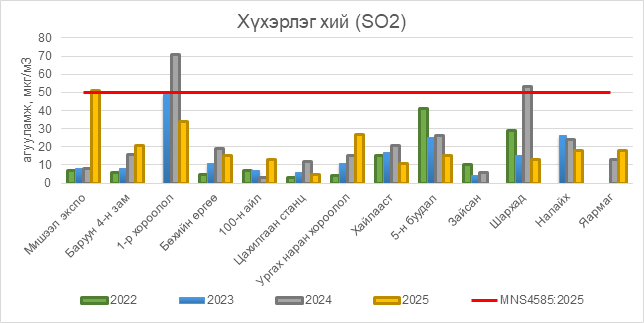 2025 оны 10 дугаар сарын 30-ны байдлаар хүхэрлэг хий (SO2) нь Мишээл экспо орчим АЧС-аас 1 мкг/м3 –ээр их, бусад цэгүүдэд MNS 4585:2025 АЧС-аас даваагүй байна.