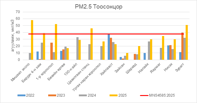 РМ2.5 тоосонцор нь Мишээл экспо орчим АЧС-аас 20.5 мкг/м3 –ээр их, Баруун 4-н зам орчим АЧС-аас 1.5 мкг/м3 –ээр их, 1-р хороолол орчим АЧС-аас 14.5 мкг/м3 –ээр их, Цахилгаан станц орчим АЧС-аас 8.5 мкг/м3 –ээр их, Зурагт орчим АЧС-аас 13.5 мкг/м3 –ээр их, бусад цэгүүдэд MNS 4585:2025 АЧС-аас даваагүй байна.