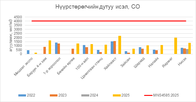 Нүүрстөрөгчийн дутуу исэл (СО) нь бүх цэгүүдэд MNS 4585:2025 АЧС-аас даваагүй байна.