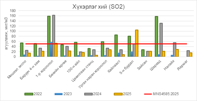 2025 оны 11 дүгээр сарын 04-ний байдлаар хүхэрлэг хий (SO2) нь 1-р хороолол орчим 3 мкг/м3 –ээр их, 5-н буудал орчим 54 мкг/м3 –ээр их, бусад цэгүүдэд MNS 4585:2025 АЧС-аас даваагүй байна.