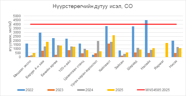 Нүүрстөрөгчийн дутуу исэл (СО) нь бүх цэгүүдэд MNS 4585:2025 АЧС-аас даваагүй байна.