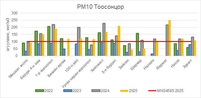 РМ10 тоосонцор нь Баруун 4-н зам орчим АЧС-аас 49 мкг/м3 –ээр их, 1-р хороолол орчим АЧС-аас 90 мкг/м3 –ээр их, Бөхийн өргөө орчим АЧС-аас 20 мкг/м3 –ээр их, 100-н айл орчим АЧС-аас 21 мкг/м3 –ээр их, Ургах наран хороолол орчим АЧС-аас 18 мкг/м3 –ээр их, Хайлааст орчим АЧС-аас 68 мкг/м3 –ээр их, 5-н буудал орчим АЧС-аас 109 мкг/м3 –ээр их, Налайх орчим АЧС-аас 5 мкг/м3 –ээр их, Яармаг орчим АЧС-аас 152 мкг/м3 –ээр их, Нисэх орчим АЧС-аас 19 мкг/м3 –ээр их, Зурагт орчим АЧС-аас 9 мкг/м3 –ээр их, бусад цэгүүдэд MNS 4585:2025 АЧС-аас даваагүй байна.