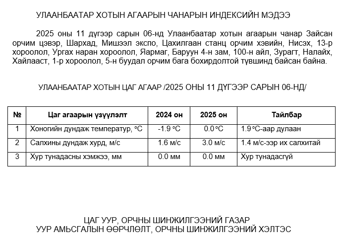 2025 оны 11 дүгээр сарын 06-ны байдлаар хүхэрлэг хий (SO2) нь бүх цэгүүдэд MNS 4585:2025 АЧС-аас даваагүй байна.