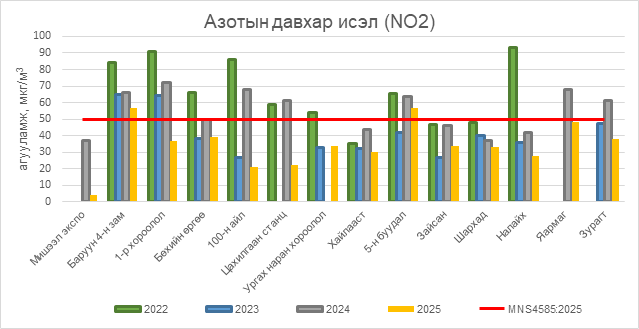 Азотын давхар исэл (NO2) нь Баруун 4-н зам орчим АЧС-аас 7 мкг/м3 –ээр их, 5-н буудал орчим АЧС-аас 7 мкг/м3 –ээр их, бусад цэгүүдэд MNS 4585:2025 АЧС-аас даваагүй байна.