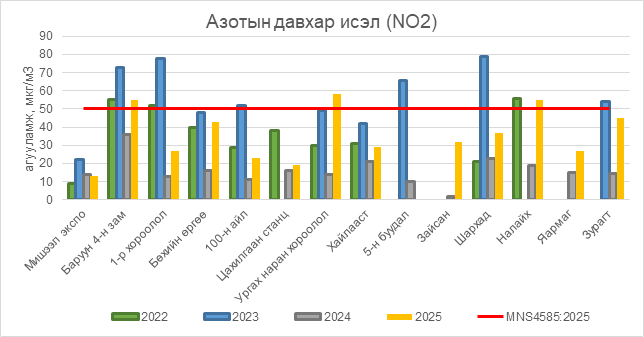 Азотын давхар исэл (NO2) нь Баруун 4-н зам орчим АЧС-аас 5 мкг/м3 –ээр их, Ургах наран хороолол орчим АЧС-аас 8 мкг/м3 –ээр их, Налайх орчим АЧС-аас 5 мкг/м3 –ээр их, бусад цэгүүдэд MNS 4585:2025 АЧС-аас даваагүй байна.