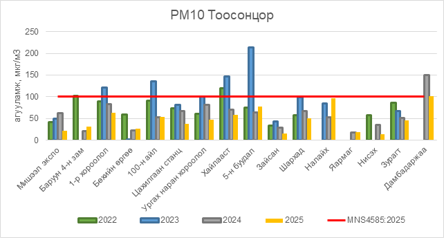РМ10 тоосонцор нь Дамбадаржаа орчим АЧС-аас 2 мкг/м3 –ээр их, бусад цэгүүдэд MNS 4585:2025 АЧС-аас даваагүй байна.