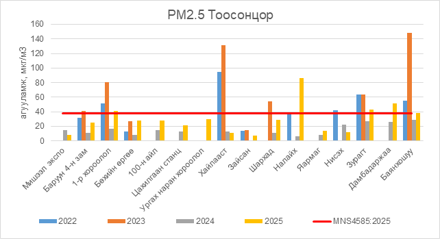 РМ2.5 тоосонцор нь 1-р хороолол орчим АЧС-аас 3.5 мкг/м3 –ээр их, Налайх орчим АЧС-аас 49.5 мкг/м3 –ээр их, Зурагт орчим АЧС-аас 5.5 мкг/м3 –ээр их, Дамбадаржаа орчим АЧС-аас 13.5 мкг/м3 –ээр их, Баянхошуу орчим АЧС-аас 0.5 мкг/м3 –ээр их, бусад цэгүүдэд MNS 4585:2025 АЧС-аас даваагүй байна.