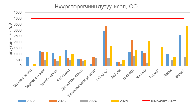 Нүүрстөрөгчийн дутуу исэл (СО) нь бүх цэгүүдэд MNS 4585:2025 АЧС-аас даваагүй байна.