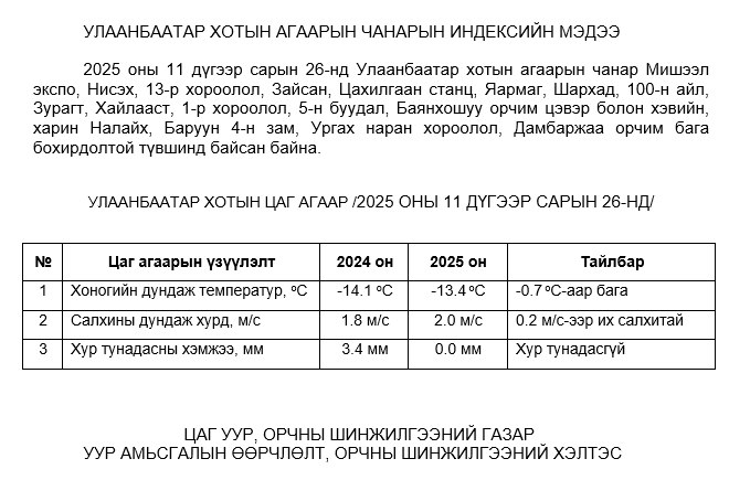 УЛААНБААТАР ХОТЫН АГААРЫН ЧАНАРЫН ХЯНАЛТ ШИНЖИЛГЭЭНИЙ ХОНОГИЙН МЭДЭЭ /2025.11.26/