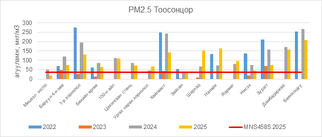 РМ2.5 тоосонцор нь Баруун 4-н зам орчим АЧС-аас 37.5 мкг/м3 –ээр их, 1-р хороолол орчим АЧС-аас 93.5 мкг/м3 –ээр их, Бөхийн өргөө орчим АЧС-аас 26.5 мкг/м3 –ээр их, 100-н айл орчим АЧС-аас 71.5 мкг/м3 –ээр их, Цахилгаан станц орчим АЧС-аас 35.5 мкг/м3 –ээр их, Ургах наран хороолол орчим АЧС-аас 29.5 мкг/м3 –ээр их, Хайлааст орчим АЧС-аас 104.5 мкг/м3 –ээр их, Шархад орчим АЧС-аас 114.5 мкг/м3 –ээр их, Налайх орчим АЧС-аас 124.5 мкг/м3 –ээр их, Яармаг орчим АЧС-аас 59.5 мкг/м3 –ээр их, Нисэх орчим АЧС-аас 9.5 мкг/м3 –ээр их, Зурагт орчим АЧС-аас 38.5 мкг/м3 –ээр их, Дамбадаржаа орчим АЧС-аас 120.5 мкг/м3 –ээр их, Баянхошуу орчим АЧС-аас 170.5 мкг/м3 –ээр их байна.